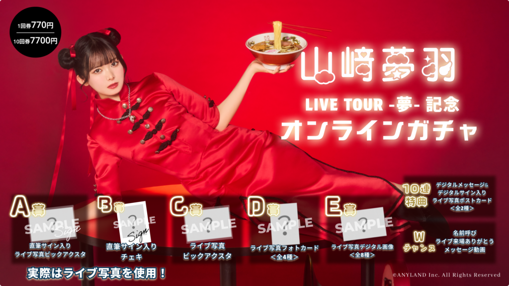また、本公演を記念し、ANYLANDオンラインガチャによる「山﨑夢羽 LIVE TOUR -夢- 記念オンラインガチャ」を1月22日(木)より実施いたします。1月17日(土)に行われた公演内のライブ写真を使用した、ここでしか手に入らない豪華グッズを数種類用意したハズレ無しのオンラインガチャを、ぜひお楽しみください。
